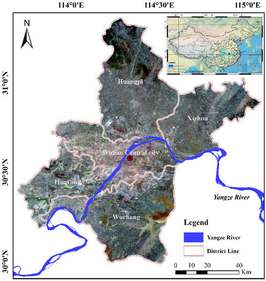 The city of Wuhan (as shown in Figure 2) lies at East longitude 113°41′–115°05′, North latitude 29°58′–31°22′, and is the only megalopolis in the west of China. Wuhan is known as ‘River City’ as it is where the third largest river (Yangtze River) in the world and the largest tributary of the Yangtze River (Han River) converge. There are also many lakes in Wuhan, such as East Lake, LiangZi Lake and so on. Dramatic changes have taken place in the city of Wuhan during the ‘Twelfth Five-Year Plan’ period (from 2011 to 2015). Furthermore, the continuous heavy rain occurred in July 2016 and some areas showed dramatic change, especially LiangZi Lake. In order to detect the dramatic changes of city and flooded regions, time-series PolSAR images were acquired from the Radarsat-2 and GF-3 sensors. In this study, our aim was to detect the dramatic changes of city and flooded region (LiangZi Lake) and monitor the changes associated with the tunnel construction on East Lake.