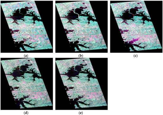 RADARSAT-2 PolSAR images acquired on (a) 7 December 2011. (b) 25 June 2015. (c) 6 July 2016; and GF-3 PolSAR images acquired on (d) 30 April 2017. (e) 29 May 2017.
