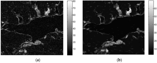The overall difference image for LiangZi Lake was obtained by omnibus test statistic algorithm using time series (2011–2015–2016) PolSAR images and it is shown in Figure 5a. Affected by speckle noise, the difference image obtained by the traditional pixel-based change detection method still contains finely divided spots in Figure 5a. For this reason, the GSRM algorithm was used for segmentation, and the result after segmentation is shown in Figure 5b. The segmentation parameters are the scale parameter and gradient threshold, which were set to 32 and 0.5, respectively.