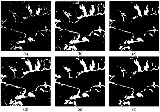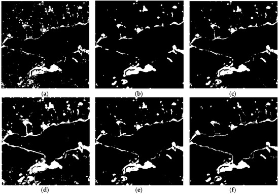 Change detection results of the different algorithms over LiangZi Lake between 2015 and 2016. (a) Change detection result using OT_GGMM_pix (k = 21). (b) Change detection result using OT_GGMM_obj (k = 33). (c) Change detection results using OT_GSRM_TDES. (d) Change detection results using OT_GSRM_KI. (e) Change detection results using OT_GSRM_Kmeans. (f) Change detection results using the OT_GSRM_GGMM (k = 25).