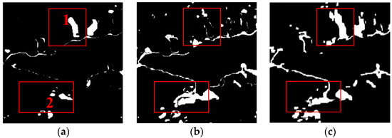 Change detection results (a) Between 2011 and 2015 using the OT_GSRM_GGMM. (b) Between 2011 and 2016 using the OT_GSRM_GGMM. (c) Between 2015 and 2016 using the OT_GSRM_GGMM.