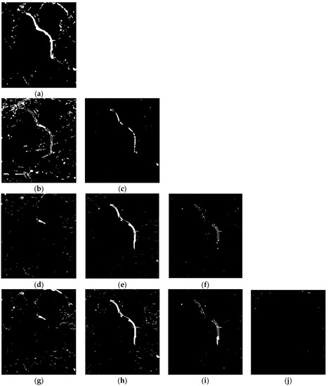 To give a visual impression of the results, Figure 12 shows the time-series change detection results over the East Lake tunnel from 2011 to 2017. Figure 12a shows the change detection result from December 2011 to June 2015, where the changes reflect the construction of the new tunnel and urbanization. Figure 12b shows the change detection result from 2011 to 2016, where the changes again reflect the construction of the new tunnel and urbanization. Figure 12c shows the change detection result from June 2015 to July 2016, where the changes reflect the removal of the ancillary buildings and urbanization. Figure 12d,g show the change detection results from December 2011 to April 2017 and from December 2011 to May 2017, where the changes reflect the urbanization. Figure 12e,h show the change detection results from December 2011 to April 2017 and from June 2015 to May 2017, respectively, where the changes reflect the removal of the ancillary buildings and urbanization. Figure 12f,i show the change detection results from July 2016 to April 2017 and from July 2016 to May 2017, where the changes reflect the removal of ancillary buildings. Figure 12j shows the change detection result from April 2017 to May 2017, where few changes can be observed.