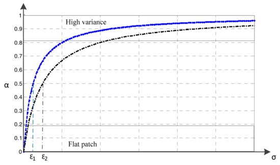 In addition, the parameter ε influences the decision thresholds of high variance area and flat patch area. Particularly, when ε = 0, the parameter a = 1, and the filtering output is the same as the input image. When σk = ε, the parameter a = 0.5. Thus, it can be seen from Figure 3 that when ε is increasing, the steepness of the curve rises slowly and the threshold of high variance significantly increases. Therefore, we can select the appropriate ε value according to the variation of the sub-window and expected smoothing effect. We set the parameter ε as 0.001–0.1 empirically.