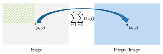 Next, a gradient integral map is generated based on the gradient feature map for enhancing the gradient information of the around range. The concept of the integral graph was first proposed by Paul Viola et al. [31]. It is applied in a real-time target detection framework. Although the integral graph can also be understood as a graph, the value of any point (x, y) in the graph refers to the sum of the grayscale values of pixels within the rectangle area from the upper left corner to the current point. The following diagram illustrates the concept of the integral graph and the generated method, as shown in Figure 4.