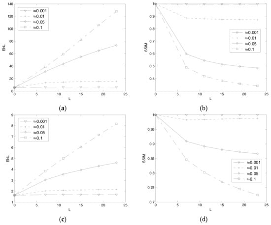 The index changing curve with different parameters. (a) Result of ENL changing curve in homogeneous region; (b) Result of SSIM changing curve in homogeneous region; (c) Result of ENL changing curve in target region; (d) Result of SSIM changing curve in target region.