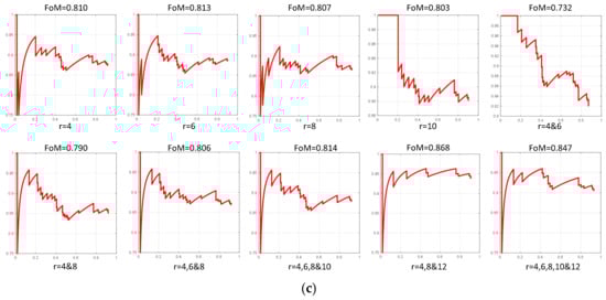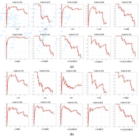 We use the line feature template with these different sizes to train the classifier and experiment on the testing data. The detection results are shown in Figure 14a. In the same way, the results of the edge feature template and line-edge combined template are shown in Figure 14b,c.
