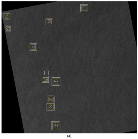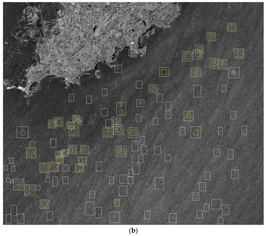 After the parameters are confirmed, the typical detection results of the proposed method in large-scale SAR images are presented in Figure 16. In particular, Figure 16b shows the detection result in bad sea condition under huge waves. It is difficult to detect the ship target using an unsupervised approach with just a few false alarms.