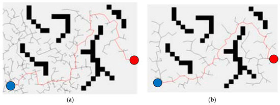 Pruning algorithm diagram. (a) Initial paths generated by the S-RRT; (b) Smooth paths using Function Pruning(T).