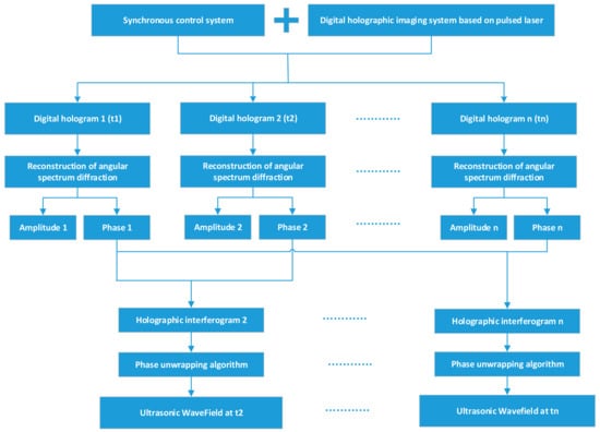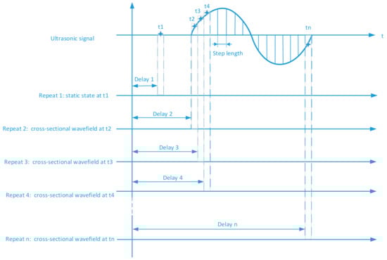 As shown in Figure 2, t1–tn are the different time points in an ultrasonic signal. The Delay 1 in Figure 2 is the delay time at first measurement (Repeat 1). At t1, the sample has not yet been excited by the ultrasonic signal, and the corresponding hologram is to measure the topographical surface of the test piece in the static state. The sampling points of the dynamic ultrasonic wavefields are t2–tn. By shifting the delay time (Delay 2) in second measurement (Repeat 2), the cross-section wavefield at t2 is obtained. Delay 3–Delay n are the delay time at t3– tn moment and the different delay times are based on the cross-sectional wavefields at different depths. As shown in Figure 2, each repeated measurement will set a delay time and the corresponding ultrasonic wavefields will be obtained.