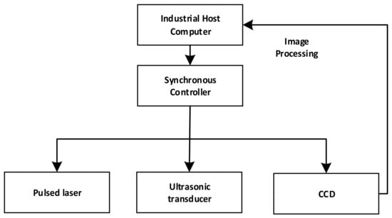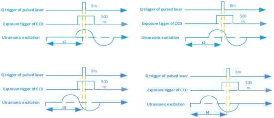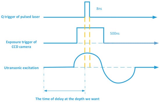 Control and synchronization is fundamental for high-quality hologram capture. The control system must provide a precise delay time between the laser pulse and the camera capture for the proposed digital holographic microscopy system. Figure 5 shows the synchronous control system, consisting of a host computer, a synchronous controller, ultrasonic transducer, a CCD camera, and a pulsed laser. The synchronous controller is implemented through the timing of National Instruments PXI-6602 (London, UK) and digital I/O modules. As shown in Figure 6, the synchronous controller is designed to ensure that the CCD camera receives the 8-ns laser pulse within its exposure time window of 500 ns, and it is also the time when the cross-sectional wavefield at the depth we want.