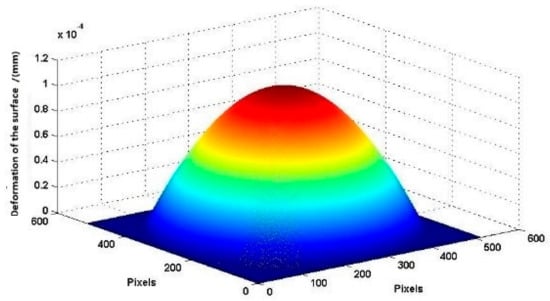 As shown in Figure 7, the maximum deformation of the surface caused by the ultrasonic wavefield is at t2. The wavelength of the simulated light source is . The pixel width of the CCD is . The angle between the reference light and the object light is . The distance between the object light and the reference light has been considered in Figure 4. Therefore, the factor is not considered in the simulation section.