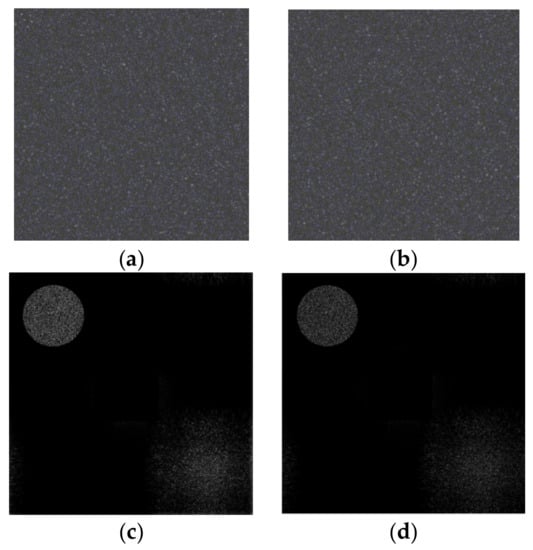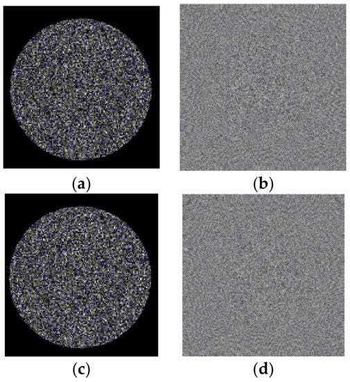 Using Fresnel diffraction theory, the object light reaching the hologram plane is simulated, and the reference light is defined. Also, the interference between the object light and reference light is simulated. The corresponding interference field intensity is calculated, and the digital holograms are formed. Using Equations (1) and (6), the holograms at t1 and t2 are obtained, as shown in Figure 8. Figure 8a is the hologram at t1, and Figure 8b is the hologram at t2. Based on these holograms, the two holograms from the angular spectrum diffraction are reconstructed. By using the angular spectrum transfer function in analytic form, the calculation required only one direct and one inverse FFT (Fast Fourier Transformation). The angular spectrum formula also rigorously satisfies the scalar wave equation, and its use is widespread in holography. Figure 8c,d shows the reconstructed plans, and the zero-order diffraction light is filtered out. After reconstructing the digital holograms, the reconstructed images of the model at t1 and t2 are obtained, as shown in Figure 9.