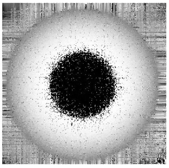 Figure 9a,c shows the amplitudes of the reconstructed image at t1 and t2, and these represent the shape of the speckled object. Figure 9a,c show that is less than the wavelength of the illumination light. Therefore, the phase of the optical wave field is represented by the arc tangent function and varies in the range of. In fact, the real phase takes a value of , which remains a random variable. Therefore, the phase shown in Figure 9b,d is a random distribution, and the deformation cannot be directly detected from the phase image. According to Equations (5) and (6), the digital interferogram of the object light field at t2 relative to t1 as shown in Figure 10, can be calculated.