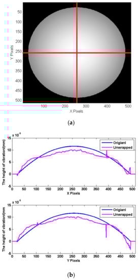 To analyze the data more clearly, the one-dimensional profile data (X and Y directions) of the initial model and the unwrapped phases are obtained separately. As shown in Figure 12a, the profile data (red line) is selected in the image. The profile data are matched to the three-dimensional data, and the phase data of the profile data are obtained, as shown in Figure 12b. It can be confirmed again that the phase after unwrapping conforms to the initial model of vibration deformation. Comparing the two sets of curves shows that the greatest error is near the center of the circle. The maximum error is 0.28 μm, about 18%.