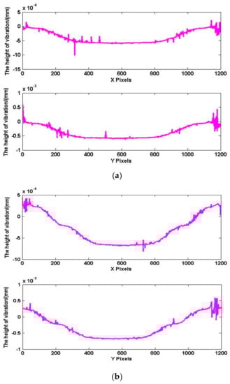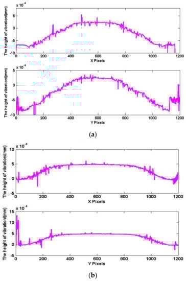 Figure 15 shows the wavefield at the transducer surface when the transducer is vibrating to the t1 moment and t2 moment, and t1 moment has the positive maximum amplitude. Due to the serious interference caused by stray light in the experiment, we used an initial median filter to mitigate interference from noise. As shown in Figure 12a, the cross-section (X direction and Y direction) is selected from the phase shown in Figure 16, and the results are shown in Figure 15. As shown in Figure 16a, the maximum amplitude is 0.89 μm. As shown in Figure 16b, the amplitude at t2 moment is 0.48 μm.