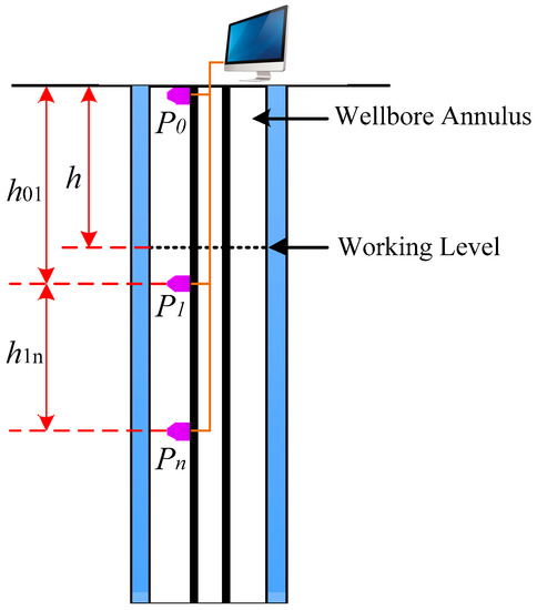 Figure 1 shows the basic principle of the pressure detection measurement. A number of pressure sensors are placed at different positions in a CBM wellbore annulus, and the values read from the sensors are represented by P0, P1, …, Pn, respectively. P0 is the pressure at the wellhead, and P1 is the pressure at a position very near to the working level. Providing that the depths of the sensors are known [9,10,11], then