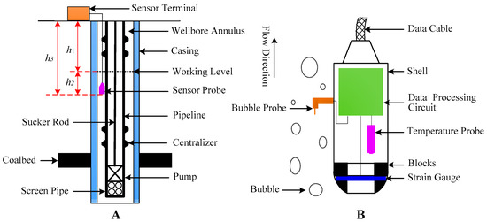 Figure 2 shows the basic principle of the sensor measurement, and Figure 2A is a schematic map of the structure of a CBM extraction wellbore. As shown in Figure 2A, the sensor consists of a probe and a terminal. Before starting the sensor, the known and necessary parameters must be input manually into the terminal. Then, the probe begins to conduct the real-time collection of well data that are simultaneously transferred to the terminal where the data will be processed and used to calculate the working level. Specifically, the working procedure of the sensor is as follows: