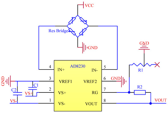 The original output data of the sensor should be 0 when the load is 0 and the temperature is constant, but the output data are not 0, i.e., null drift occurs. Causes of null drift include initial deformation of the strain gauge and the irreversible and permanent residue deformation of the strain gauge when it suffers a large hit. The AD8230 chip (Analog Devices, Norwood, MA, USA) was used for building the hardware circuit to solve the problem of null drift, as shown in Figure 3 [21].