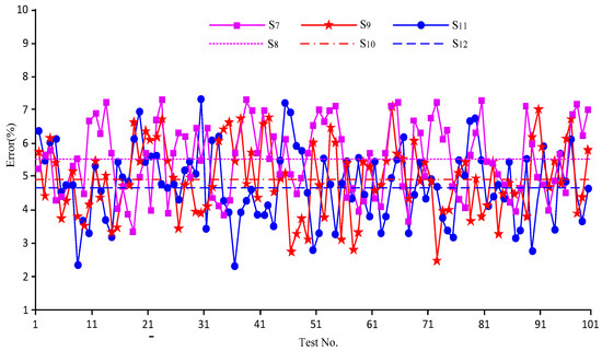 Measurement error curves of the sensor when measuring the bubble flow under different pressures. S7: error under the pressure of 0.8 MPa and at 20 °C; S8: mean value of S7; S9: error under 0.4 MPa and at 20 °C; S10: mean value of S9; S11: error at 0.1 MPa and at 20 °C; S12: mean value of S11.