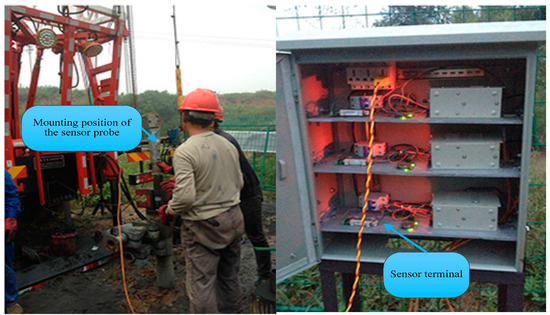 Test Procedure: Mount the sensor probe on a custom-designed gauging nipple that is connected to the pipeline (as shown in Figure 15). Control the depth of the pipeline to place the sensor probe at the designated depth of the CBM well and then turn on the power. The data collected by the sensor probe will be simultaneously transferred to, displayed on, and stored in the sensor terminal via a cable. The sampling frequency of the sensor probe is 200 Hz, and the memory capacity of the sensor terminal is 8 GB. The overall power consumption is 103 ma and the expected lifetime of the system is 8 months.