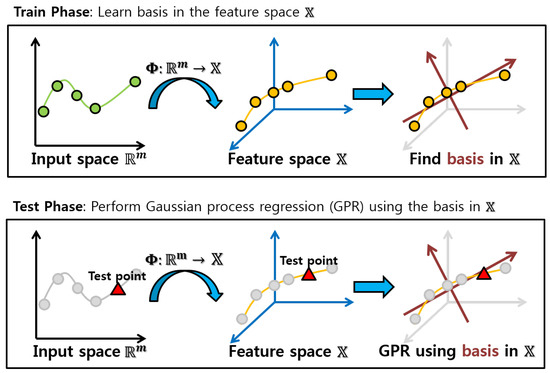 where is a projected kernel vector into the orthogonal feature space by the projection matrix and is a projected output by . This means that and act as new representative factors by the orthogonal projection for Gaussian process regression problems, with conversion of the inverse of a kernel matrix into an identity matrix which reveals independence among basis vectors. Hence, Equation (5) is a new representation over in the low-dimensional orthogonal feature space. A conceptual representation of the kernel subspace learning with the low-rank property used in Gaussian process regression is illustrated in Figure 1.