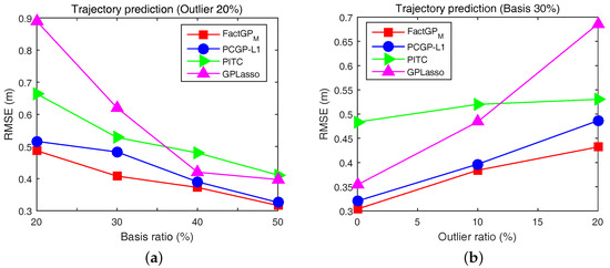 Motion prediction results based on human trajectories with respect to: (a) various basis ratios in the existence of 20% outliers; and (b) various outliers while 30% basis ratio is fixed.