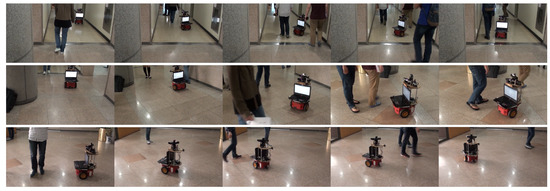The proposed motion model and motion controller are applied in other environments, including an L-shape lobby and a school cafeteria. The goal was to reach the goal region under a dynamic environment with many moving pedestrians. Figure 11 and Figure 12 show some snapshots from the experiments in an L-shape lobby and a crowded school cafeteria, respectively. In all experiments, the robot with the proposed motion model and controller successfully navigated without collisions by avoiding pedestrians and arrived at the goal region.