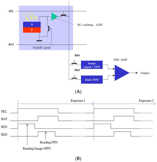 (A) Solar-cell mode photodiode-based logarithmic pixel and its readout chain; and (B) the associated control timing for readout operation with on-chip FPN compensation.