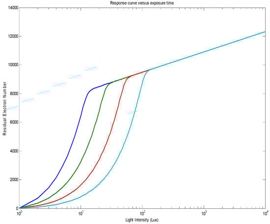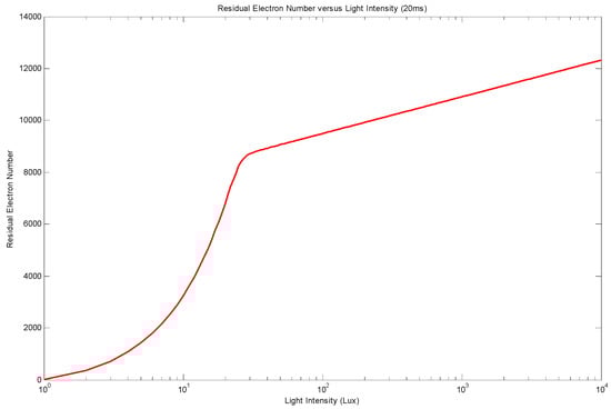 It is not possible to have a closed-form solution of Equation (4), but a numeric resolution can be applied. By using realistic parameters from a common CMOS process, such as and , the residual electron number versus light intensity is shown in Figure 3. This residual charge number with a fixed integration time follows two regimes: (1) linear regime at low photo flux and (2) logarithmic regime at high photo flux. A sharp transition connects these two regimes together.