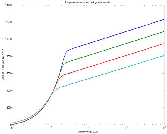 Response curves for different dark generation rates (10 e/s, 100 e/s, 1000 e/s, and 10,000 e/s in order from top to bottom). The same buried photodiode parameters as in Figure 3 have been used. The linear–logarithmic transition points match well the values calculated from Equation (6).