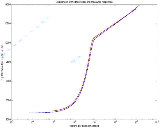 The measured response curve (blue dashed) superposed with the calculated response from Equation (4). The exposure time was set at 20 ms and estimated quantum efficiency was about 5% (Fill-Factor = 8%). The operating temperature of the sensor was 25 °C.