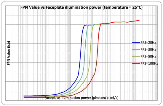 The impact of the dark generation rate (dark current) on the response curve is shown in Figure 4. A higher dark generation rate will generate a proportional positive offset in the linear regime and logarithmically negative offset in the logarithmic regime. Taking into account that the dark generation rate is an exponential function of temperature, the temperature change will generate a temperature–linear negative offset on the logarithmic response, the same as in solar-cell mode pixels. The logarithmic regime will arrive earlier with a higher dark generation rate.