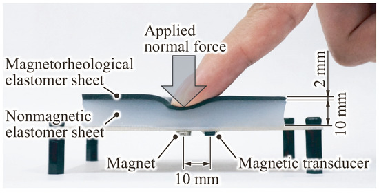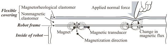 Figure 3 illustrates the structure and sensing mechanism of the proposed sensor. The sensor is composed of a flexible dual-layer elastomer, a robot frame holding a permanent magnet and a magnetic transducer, which responds to the amount of magnetic flux penetrating its body. As described in Figure 3, left, the magnetization of the magnet is in a direction perpendicular to the dual-layer elastomer. The lower layer of the elastomer is a nonmagnetic base elastomer (BE) sheet, whereas the upper one is a magnetorheological elastomer (MRE) sheet, which contains particles with a high magnetic permeability, such as iron particles.