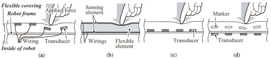 - Type D, Transducers are placed inside the robot with their markers inside the covering: For this type of sensor (Figure 2d), the transducers can be removed from the part where a contact force is applied; instead, the transducers are placed inside the robot. The applied loads are estimated by monitoring the displacement of the markers embedded inside the covering.