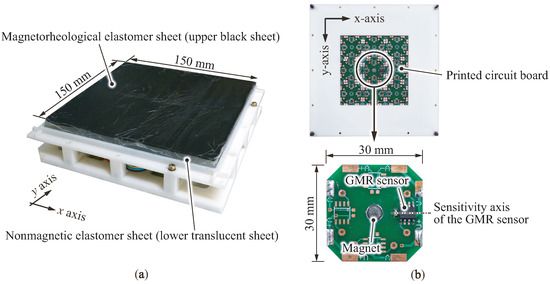The appearance and an overview of the proposed sensor are shown in Figure 4a,b. The dual-layer elastomer is 150 mm long, 150 mm wide and 12 mm thick in which a 2 mm-thick MRE sheet is laminated onto a 10 mm-thick BE sheet. Both elastomer layers are made of a low-rigidity platinum-cured elastomer (Smooth-on Inc., Macungie, PA, USA, Dragon Skin FX Pro), which is compounded with a plasticizer (Smooth-on Inc., Macungie, PA, USA, Dragon Skin Thinner) with a mass ratio of 200%. In this study, we employed carbonyl iron particles (BASF Corp., Ludwigshafen, Germany, hard grade HQ type) with a particle diameter of 2 m at a volume ratio of 20%. To make the MRE sheet, we mixed iron particles in the platinum-cured elastomer before curing and poured it into a rectangular female mold until curing.