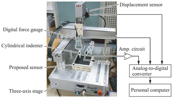 Figure 5 shows the experimental setup for investigating the sensor response curve and spatial response. The proposed sensor was mounted to a three-axis robot stage (IAI Corp., Shizuoka, Japan, TTA-C3-WA-30-25-10) holding a digital force gauge (Nidec Corp., Kyoto, Japan, FGP-5) with a measurement force resolution of 0.01 N and a temporal resolution of 1 ms. The tip of the force gauge was equipped with a plastic cylindrical indenter with a diameter of 10 mm. To measure the vertical displacements precisely, the stage was also equipped with a laser displacement sensor (Omron Corp., Kyoto, Japan, ZX0-LD100A61) with a resolution of 0.08 mm.