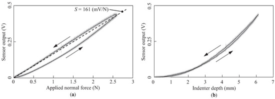 Sensor response curves with a contact speed V of 0.1 mm/s: (a) the sensor output versus the applied normal force; (b) the sensor output versus the indenter depth.