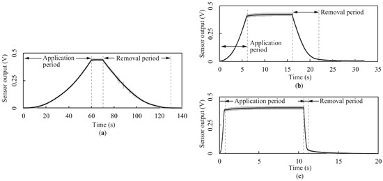 In order to evaluate the effect of the contact speed, we measured the sensor outputs with time for three different contact speeds, as shown in Figure 7. The solid lines and shaded regions denote the mean value and twice the standard deviation () of the sensor outputs across 20 trials, respectively. In each plot, the application and removal periods indicate the periods wherein the load was being applied and removed, respectively. The results demonstrate that the sensor outputs varied similar to a quadratic curve for every speed. On the other hand, for speeds of 1 and 10 mm/s, the outputs slightly increased to their steady outputs after the application period. The differences between the outputs just after the application period and the steady outputs were 15.9 and 29.8 mV for speeds of 1 and 10 mm/s, respectively. Furthermore, the outputs remained at small values even though the loads were completely removed, and these remaining outputs gradually returned to the zero level within a few seconds. The remaining outputs were 18.1 and 29.5 mV for speeds of 1 and 10 mm/s, respectively; thus, a higher speed resulted in a larger remaining output.