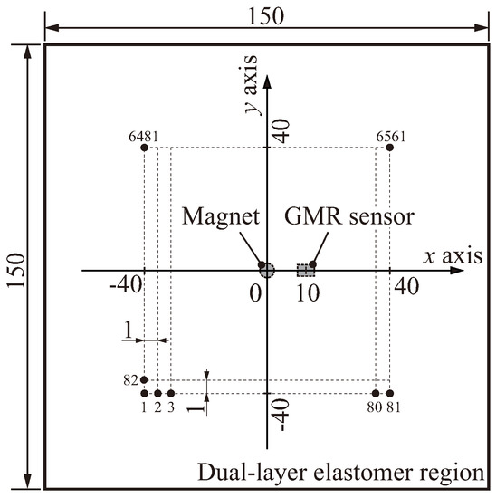 To determine an appropriate spatial layout for the proposed sensor for large-area implementation, the spatial response was investigated using the same setup. Figure 8 illustrates the measurement region and positions of the spatial response. The black dots in the figure indicate the center positions where the load was applied, i.e., the center of the indenter. In accordance with the index numbers (1, 2, ..., 6561) of the dots, the indenter moved from x = −40 mm to x = 40 mm and from y = −40 mm to y = 40 mm in 1-mm steps along each axis. The positions of the magnet and GMR sensor corresponded to (x, y) = (0, 0) and (10, 0), respectively.