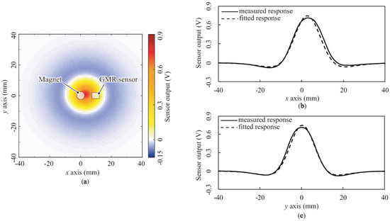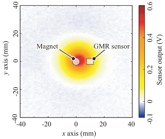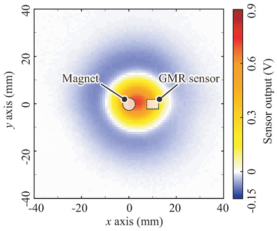 - The center of the spatial response (, ) is at a point that is closer to the magnet along the line connecting the centers of the magnet and GMR sensor.