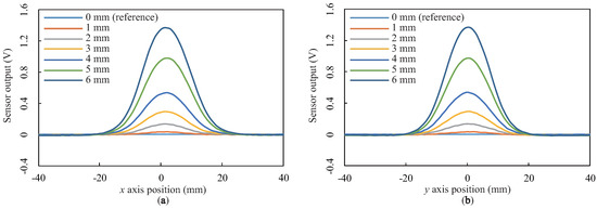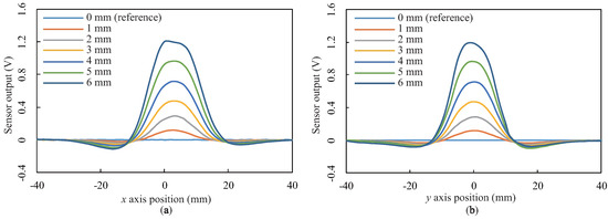 We again summarize the results as line profiles along the x and y axes through the center () = (2, 0). Figure 12 shows the line profiles for the seven different depths with the sponge sheet instead of the BE sheet. As in Figure 11, negative responses were not observed for all depths. Regardless of the depth, the widths of the responses along the x and y axes were approximately 44 and 40 mm, respectively. These results demonstrate that the negative response is derived from the incompressibility of the BE sheet and not from magnetic transduction.