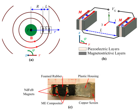 The novel gradient-type ME current sensor based on the product effect of current-induced MFG effect and the MFG-induced ME effect: (a) top-view of current sensor assembly configuration and magnetic fields (B) and its gradient () generated in the vicinity of a current (I)-carrying cable (b) structure of ME composites pair in the sensor, in which M denotes the magnetization direction of the magnetostrictive layers and P indicates the polarization direction of the piezoelectric layer; (c) packaged prototype.