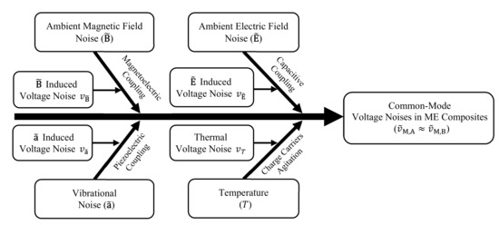 Figure 2 shows the multisource noise coupling mechanism in the sensor using Ishikawa diagram. In Equation (8), and are contributed by magnetic fields noise ()-induced voltage noise (), electric field noise ()-induced voltage noise (), vibration noise ()-induced voltage noise (), and thermal voltage noise () as: