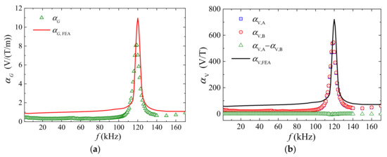 Figure 3a plots the frequency (f) dependence of the measured and calculated gradient-ME voltage coefficient ( and ) of the sensor using the methods in [30]. The and spectra are quantitatively similar to the spectra in Figure 3b, suggesting the determination of by and described by Equation (8). Non-resonance of 0.34 V/T/m is achieved over a broad frequency range of 1 Hz–80 kHz, while the highest of 8.6 V/(T/m) is obtained at resonance frequency, of 120 kHz.