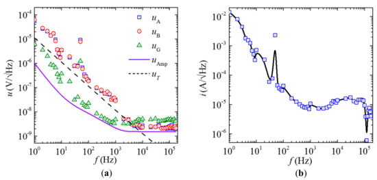 Figure 5a shows the measured voltage noise density spectra of each ME composites ( and ), the current sensor (), and the lock-in amplifier noise floor (), together with the calculated thermal noise density () spectra in a magnetically-unshielded laboratory environment at 20 °C without intentional interference. The spectra were obtained using the same method as in [30]. Since the effect of the ambient electric field noise is minimized by the copper screen shielding, the , , and spectra in Figure 5 are dominated by the thermal noises from 1 Hz to 3 kHz. In the frequency range of 20–150 Hz, the power-frequency noise arising from the magnetically-unshielded laboratory environment has an obviously added effect on . In the further elevated frequency range of 3–170 kHz, the noise associated with measurements circuit is active since , , and all fluctuate over constant values. Beyond 3 kHz, becomes double of and , which can be explained by the phase-lag between the voltage noises ( and ) in the two ME composites at high f because the voltage noises have random phases at high f (i.e., > 3 kHz).