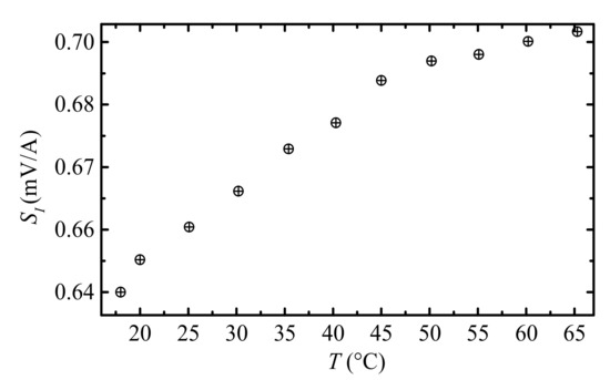 Figure 6 shows the measured temperature (T) dependence of current measurement sensitivity (). The – curve characterized in a modified non-magnetic turbo convection oven (Fangchu®, Guangzhou, China), with two via holes on the top and bottom covers to enable the straight current carrying cable pass through the oven. By controlling the temperature slowly increase from 18 °C to 65 °C with step of 5 °C and 10 min holding time to ensure thermal equilibrium state of the system, the