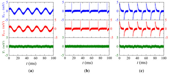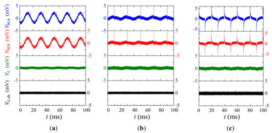 Experimental results of ambient electric field noises: ()-induced voltage noises in , , and when is created by exciting (a) sine wave, (b) pulse width modulated, and (c) square voltage signals on two copper plates, respectively. (The peak-value of is approximately 1000 V/m for all cases).
