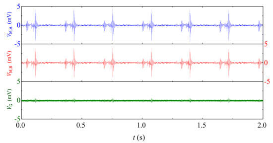 Figure 8 shows the experiment waveforms of -induced in and , and in when the is artificially created in sine, pulse, and square waveforms, respectively. Experiments are conducted by assembling the sensor in the middle of two home-made copper plates with separating distance of 50 mm, by applying voltage excitation to the two copper plates by voltage amplifier (AE Techron® 7548, Elkhart, IN, USA) connected to an arbitrary waveform generator (Agilent® 33210A, Santa Clara, CA, USA), and by recording , ,and using an oscilloscope (Tektronix® MSO2014, Beaverton, OR, USA). The two coppers plates both have width, length, and thickness of 100 mm, 100 mm, and 1 mm, respectively. Figure 8a shows the waveforms of , , and when the excitation voltage is sine wave with amplitude of 50 V (). Figure 8a suggest that 50 Hz components of in and amplitudes are approximately 2.1 mV, while the 50 Hz component of in is 0.18 mV. The in is evaluated to be 11 times smaller than in and , and the CMRR is evaluated to be 21 dB without the copper screen shielding. Figure 8b shows the -induced waveforms of , , and when the copper plates are driven by pulse width-modulated voltage signal with pulse width of 10 , rising edge of 40 ns, and period of 20 ms in analogous to possible, voltage-induced raising from the ON/OFF action of the electrical system. Figure 8b suggests that the peak values of in and are approximately 5 mV, while peak values of in are 0.7 mV. The in is evaluated to be 7 times smaller than . in and , and the CMRR is evaluated to be 17 dB without the copper screen shielding. Figure 8c shows the -induced waveforms of , , and when the copper plates are driven by square voltage signal at 50 Hz. Figure 8c suggests that the peak values of in and are approximately 5.8 mV, while peak values of in are 0.8 mV. The in is evaluated to be 7.2 times smaller than in and , and the CMRR is evaluated to be 17 dB without the copper screen shielding.