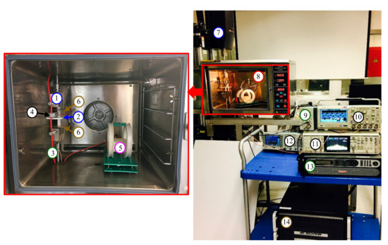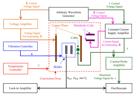 Experiment system for multisource noise suppression performance evaluation. Labels with colors of magenta, brown, blue, green, and red represent -, -, -, -, and T-related equipment, respectively. (1. Vibration head; 2. Holder; 3. Cable; 4. Sensor; 5. Helmholtz coils; 6. Copper plates; 7. Vibration controller; 8. Convection oven; 9. Current probe amplifier; 10. Oscilloscope; 11. Lock-in amplifier; 12. Arbitrary waveform generator; 13. Constant-current supply amplifier; 14. Constant-voltage amplifier).