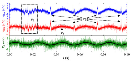 When the gradient-type ME current sensor is working in multisource noises-interfered environment to sense in a cable, voltage noises in each ME composite are essentially common-mode noises (). Therefore, the real output voltage from the sensor () can be derived by combining Equations (6)–(9) in form of the superposition of current signal part and noise part ():